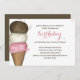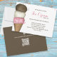 Este design apresenta um giro aniversário de sorvete de aquarela, um roteiro de caligrafia de na moda, URL online do site de código QR, página de eventos nas redes sociais do Facebook, uma divertida comemoração branca festiva, um cone de waffle de sorvete, um simples design mínimo minimalista, uma festa de comemoração de aniversário de verão, um cor-de-chocolate branco rosa, um sorvete de sabor napolitano