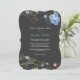 Uma ilustração original de flores românticas de verão, hibiscos azuis e roxos, crisântemos brancos com flores em pompom com videiras verdes onduladas e silhueta de pássaros andorinhas cor-de-rosa caprichosos em um fundo de lousa / cinza carvão escuro. Um belo design floral tropical e elegante para casamento de jardim.