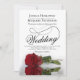 Este belo convite para o casamento apresenta uma linda fotografia de uma rosa vermelha de longo solteiro empilhada sobre o seu lado refletindo numa piscina de água com ondas e ondulações. O design apresenta um roteiro de caligrafia rico com um fazer de cauda longa e encaracolada, moderno e clássico. Uma maneira elegante, sofisticada e chique de convidar seus amigos e família para compartilhar seu dia especial. A parte de trás do cartão é uma cor vermelha pesada com um padrão de pelúcia.