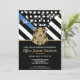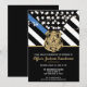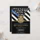 Este design apresenta uma bandeira de força policial com listras pretas e brancas, e também uma faixa de linha azul fina. O distintivo da polícia e o texto em dourado ficam acima de todos os detalhes da festa para a aposentadoria do oficial de aplicação da lei, xerife, capitão ou chefe de polícia.