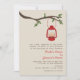 Um convite do casamento do ar livre com uma região selvagem/tema de acampamento que caracteriza uma ilustração de uma lâmpada de óleo vermelha que pendura de um ramo de árvore com folhas verdes. Personalize o texto com sua informação. O fraseio é dos pais da noiva.