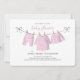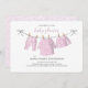 Esta design apresenta um simples convite para chás de padrão floral, cor-de-rosa, de uma menina, com roupas mínimas minimalistas, com um código QR para o site de registro de presentes e um belo pacote de roupas de linha branca, uma elegante caligrafia de escrita, uma linha de roupa de menina aquática, uma roupa de criança criativa e doce, para a mãe ser mamãe mãe, um simplista de cor-de-na moda, um convite para uma menina bonita, um doce convite para chás de bebês, com um registro de presentes ícone no verso.