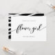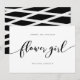 Elegante cartão "Você Será Minha Dama de Flores" apresentando a palavra "flor" em uma fonte cursiva relaxada preta contra um fundo branco. O cartão tem um verso preto com linhas brancas sobrepostas.