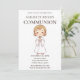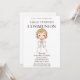 Celebre o dia especial de sua filha com este belo convite da Primeira Comunhão, com uma ilustração de uma garota sorridente em um vestido clássico de comunhão. Esta design elegante e sincera é perfeita para convidar a família e os amigos a juntarem-se à celebração sagrada. Personalize facilmente com o nome da honraria, os detalhes do evento e uma mensagem pessoal para criar uma manutenção exclusiva para este marco importante