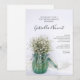 Convide os convidados para celebrar a noiva e o noivo recém-casados na manhã após a cerimônia de casamento com o charmoso convite de jantar/brunch pós-casamento com flor de bebê em vaso azul. Este encantador convite floral personalizado para café da manhã ou almoço pós-casamento apresenta uma fotografia floral delicada de um jarro de vidro azul rústico repleto de flores brancas de bebê no caule ou Gypsophila paniculata com cetim branco. Inspiração perfeita para um evento de celebração de festa de jardim de verão.