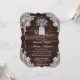 O convite para o casamento do bebê russo, com flores de hálito de bebê dentro a jarro de pedras contra um fundo de madeira rústica adornada com rendas florais brancas. Este convite de casamento floral rústico é perfeito para o seu país rústico, ou festa de casamento de celeiro inspirada no hálito do bebê.