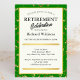 Faça uma grande declaração com o nosso Convite de festas de Reforma Formal Elegante! A "Celebração de Aposentadoria" do painel central, fora do branco, é elegantemente criada em uma combinação de fontes serif e script, adornada com ornamentos intrincados, fornece um quadro sofisticado para seus detalhes personalizáveis, incluindo nome, data, endereço e RSVP. Coloca-se contra um padrão de mármore verde e dourado. Projetado para organizadores de família e corporação.