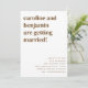 Estes belos convites para o casamento apresentam um padrão retrorgeométrico colorido em castanho, rosa e amarelo, uma estética minimalista, e estão conscientes do orçamento porque só precisamos deste cartão se tivermos um site de casamento que possamos usar para fornecer aos nossos convidados todos os detalhes.
