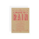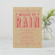 Divertido e retrógrado convidativo para o chá de bebê com a manchete "faça chover". O design é cor-de-rosa-framboesa sobre um fundo de textura marrom-claro de papelão.