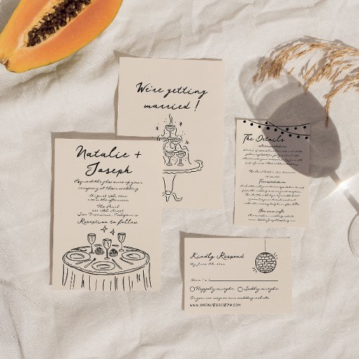 Este convite para o casamento é perfeito para o seu casamento se você está procurando um elegante convite para fotos único e fácil de editar. Um elegante e único creme minimalista e um convite para modelo de imagens de casamento desenhado à mão negra. Que apresenta um fundo comum cremoso vintage na frente e puxado à mão de pratos e copos. E a ousada mão negra escreveu os primeiros nomes da noiva e noiva, e informações editáveis. Com foto personalizável no verso e código QR personalizável. Barato e é também um e-convite eletrônico digital se você quiser enviá-lo por texto ou email. Todas as informações são personalizáveis clicando no botão personalizar. Então pegue-o e faça-o seu para que você faça você convidar noivos e excitados.