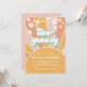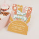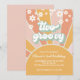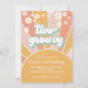 dois Convites de Aniversário de um ano inspirados no Retro Ensolarado Groovy com margaridas estilo anos 70 e fontes e cores boho.