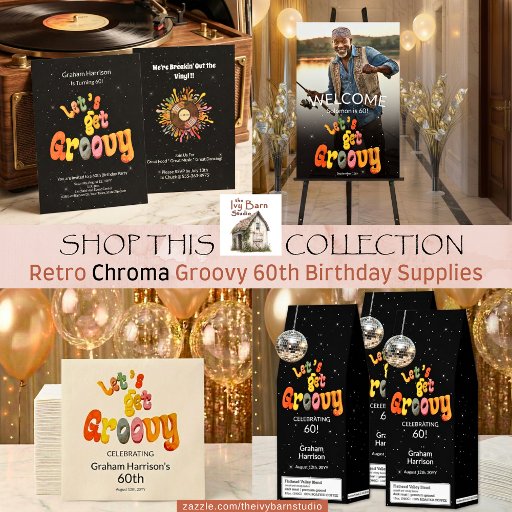 This will get guests excited to come to the 60th birthday party they are now invited to! Unique Retro Let's get Groovy design that's colorful and tasteful with it's Chroma Coloring ! On the back is a Retro Record Player and some "Cool Vibes" coming from it. The words below it promise great food, great music, and great dancing! Who wouldn't want that!?! Get excited and plan away!