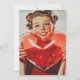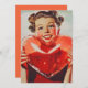 Uma imagem nostálgica da década de 1950 de uma jovem sorridente segurando um objeto brilhante, oco, em forma de coração. Seu vibrante traje vermelho e sua expressão alegre evocam calor, alegria e romance eterno, capturando o charme vintage da época.
