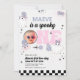 Retro Purple Halloween Spooky Um primeiro aniversario Invitation Halloween assusta um tematizado de primeiro aniversário para uma menina com dois fantasmas ranzinza, uma teia, aranhas, estrelas, abóboras bonitinhas e retro texto em preto e roxo. Este convite de primeiro aniversário assustador também apresenta um padrão de tabuleiro de xadrez e é ideal para uma primeira festa de aniversário de outubro para uma menina.