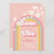 Sete é um Vibe! Convite de 7 de aniversário inspirado retroativamente com fontes e cores estilo 70, arco-íris e margaridas a rosa