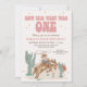 Rustic Pink Retro How The West was One primeiro aniversario Invitation Cute retro como o oeste foi um primeiro convite de aniversário para uma menina com vaquinha, chapéu de vaquinha, paisagem desértica ocidental com cactos e algum texto retrô. Esta vaqueira que fez o primeiro convite de aniversário para uma garota é ideal para uma primeira festa de aniversário do tema ocidental.