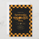 The design grabs attention instantly with a bold, high-contrast orange and black checkered pattern background. It gives off a cool, vintage skater-meets-Halloween aesthetic that stands out in the mail (or the inbox). Front and center, the invitation features the festive quote "Spooktacular Halloween Party," letting everyone know this is going to be the event of the season—whether it's for kids, adults, or just the boos.