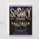 Convite de festas de Figurino de Pastel Halloween - Defina o tom para uma festa inesquecível de fantasia de Halloween com este retrô, vintage aestética Spooky Season convite com cores pastel em um fundo preto. Um quadro de padrão de prancheta de xadrez roxo e branco e fontes vintage, grunge angustiadas. A design apresenta todos os ícones clássicos assustadores e assustadores do Halloween, como um gato preto contra uma lua de cheio, abóbora esculpida de lanternas, fantasmas assustadores, morcegos voadores e outras coisas assustadoras. Personalize este modelo de convite de festa do Dia das Bruxas editável com seus próprios detalhes de evento. Disponível como convite para impressão ou download digital instantâneo, envie-o facilmente via texto, email ou mídia social.