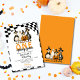 Padrão de Quadro de Verificação Retroativo Ondulado Um Convite de primeiro aniversario para o Dia das Bruxas de Ganso Estranho - Comemore um ganso de bobo nesta temporada de Halloween com este bonitinho, retrô, ganso estético de vintagem com o primeiro convite de festa de aniversário. Apresentando quatro gansos vestidos de trajes de Halloween: uma bruxa ou feiticeiro, um fantasma assustador, um jack de abóbora esculpido ou uma lanterna, e um esqueleto engraçado, pronto para fazer truques ou tratar de uma comemoração espetacular. O design tem um padrão de tabuleiro de xadrez ondulado e um arco no fundo. No Halloween clássico e cores de queda de laranja, preto e branco. Personalize este modelo de Primeiro Convite de aniversário do Halloween editável com seus próprios detalhes de evento. Disponível para pedidos de impressões ou como e de download digital instantâneo, fácil de enviar via texto, email ou mídia social.