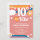 O bonitinho retrato 10 é um convite de aniversário. Foto popular retrô-arco-íris, estrelas, flores e estilo 60s. Disponível como um download digital imprimível. Excelente para qualquer estação. Cor rosa retro pastel.