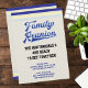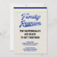 É mais uma vez hora de reunir todos os seus parentes e reconectar-se numa comemoração da reunião da família. Prepare-se para um piquenique, uma viagem à praia ou outro evento divertido. Tipografia do estilo de vintagem retrorativa em cores azuis. Monograma com nome de família. Adicione detalhes sobre o seu evento.