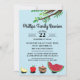 Engraçada reunião familiar com formigas carregando comida de piquenique incluindo melancia e bolo e campos de texto personalizáveis para suas informações de reunião de família.