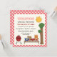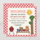 Convite anual de reunião da família de piquenique de biscoitos de churrasco com gingham vermelho ou fronteira de vichy apresentando uma mesa branca com toalha de mesa e hambúrgueres, salada de batata, melancia e suco de laranja nele, uma grelha de barbeque de gás vermelho, uma árvore e o sol. Excelente para um piquenique de verão. Elementos de arte de Alice Smith.