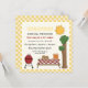 Convite anual de reunião da família de piquenique de biscoitos de churrasco com gingham amarelo ou borda de vichy apresentando uma mesa branca com toalha de mesa e hambúrgueres, salada de batata, melancia e suco de laranja nele, uma grelha de barbeque de gás vermelho, uma árvore e o sol. Excelente para um piquenique de verão. Elementos de arte de Alice Smith.