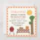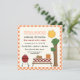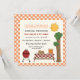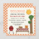 Convite anual de reunião da família de piquenique de biscoitos de churrasco com gingham de laranja ou fronteira de vichy apresentando uma mesa branca com toalha de mesa e hambúrgueres, salada de batata, melancia e suco de laranja sobre ela, uma grelha de barbeque de gás vermelho, uma árvore e o sol. Excelente para um piquenique de verão. Elementos de arte de Alice Smith.