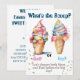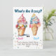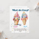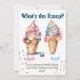 Gênero do sorvete Revele Convite de festas Cuta e o gênero moderno e moderno e moderno revelam um cartão de convite de festas com ilustração aquosa do sorvete em cones de waffle, em rosa e azul, com abertura de geleiras de ouro. O texto diz: "Qual é o furo? Menino ou Menina?" Perfeito para uma festa de gênero no verão.