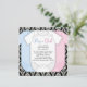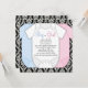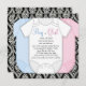 Damasco preto adorável com bebê rosa, azul e branco, uma peça camisa sexo bebê revela convites para chás. Este convite de revelação de gênero bonito é fácil de personalizar adicionando seus detalhes à frente e atrás simplesmente adicionando seus detalhes de evento, estilo de fonte, tamanho de fonte e cor e texto.