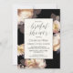 Um chá de panela floral sumptuoso e moderado, com tulipas, bagas e folhas esbranquiçadas, num fundo preto contrastante. Este elegante design usa uma combinação de pares de fontes modernos rodeados por um quadro central esbranquiçado. Personalize o texto de exemplo mostrado no modelo de design com os detalhes do seu chá de panela. O belo trabalho de arte usado neste design é de www.createthecut.com.
