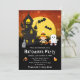 Este convite de Halloween divertido e assustador apresenta uma bruxa e um fantasma bonitinho ao lado de uma casa assombrada. Ao fundo está uma lua de cheio com morcegos e um céu noturno laranja com estrelas. O texto combina fontes decorativas e serif para um aspecto na moda e moderno. Isto é perfeito para o Halloween.