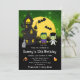 Este convite de aniversário divertido e assustador mostra monstros Frankenstein bonitos ao lado de uma casa assombrada. Ao fundo está uma lua de cheio com morcegos e um céu noturno verde com estrelas. O texto combina fontes decorativas e serif para um aspecto na moda e moderno. Isto é perfeito para o Halloween.