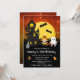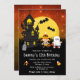 Este convite de aniversário divertido e assustador apresenta uma bruxa e um fantasma bonitinho ao lado de uma casa assombrada. Ao fundo está uma lua de cheio com morcegos e um céu noturno laranja com estrelas. O texto combina fontes decorativas e serif para um aspecto na moda e moderno. Isto é perfeito para o Halloween.