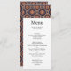 Cartão de menu com um padrão repetitivo de elementos decorativos de ornamentados em forma de flor, estrela e sol.