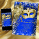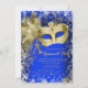 convite de festas azul real rico mascarada com uma bela máscara de joia dourada sobre um elegante fundo azul-real do boque e design brilhante dourado no verso. Este belo convite de festas azul e mascarada dourado é facilmente personalizado para o seu evento simplesmente adicionando os seus detalhes no estilo de fonte, cor e texto da sua escolha.