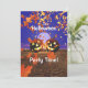 Um convite para festas de Halloween com a minha imagem de lua de cheio, folhas voadoras de outono e duas abóboras rindo.