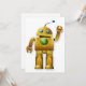 Robôs podem ser amigáveis como esta design prova. Este design é um robô amigável que está parado e acenando. O robô é dourado e tem um botão verde no peito e olhos verdes. Este design de robô amigável parece excelente nesses convites