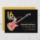 16 Rochas 16ª convites de festas de aniversários com um legal padrão funky colorido de guitarra elétrica e uma pintura de guarda rosa, guitarra e ilustração musical com tipografia personalizada de caligrafia moderna em preto e ouro. Essa modelo fácil de usar cria o convite personalizado perfeito para celebrar dezesseis no estilo rock n roll e é ideal para um guitarrista, músico e amante da música. Qualquer guitarrista lhe dirá que você nunca pode ter muitas guitarras. Este legal instrumento musical moderno design celebra a energia musical deste maravilhoso instrumento musical e é a forma perfeita de balançar uma celebração do décimo sexto aniversário. Arte original da artista Catherine Sweetman
