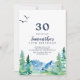 Este convite à aniversário de 30 anos Rocky Mountain é perfeito para uma festa de aniversário ao ar livre. O design apresenta uma paisagem de natureza selvagem pintada, azul e verde, com pinheiros de aquarela, pássaros e montanhas.
