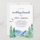 Este convite para o casamento da Montanha Rocky é perfeito para um evento ao ar livre. O design apresenta uma paisagem de natureza selvagem pintada, azul e verde, com pinheiros de aquarela, pássaros e montanhas.