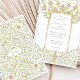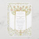 Este convite romântico de casamento combina a elegância de Rococo com a suavidade de Art Nouveau, apresentando um quadro floral pintado à mão de botões de flores cor-de-rosa, videiras brancas e sotaques de rolagem ouro. O design de fronteira delicadamente envolve o texto do convite com um fluxo natural e orgânico, criando uma estética imaginária sonhadora. Os tons pastéis de pincel, sage e borboleta são cuidadosamente detalhados com um acabamento de aquarela que adiciona profundidade e graça. O verso apresenta um modo de jardim simétrico formado por tufos de folhas entrelaçadas e botões florais em uma camada de ouro refinada. Com seu charme histórico e capricho botânico, esta design é perfeita para casamentos inspirados pela natureza, pelo patrimônio ou pela elegância europeia.