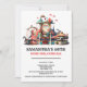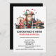 Uma cena de um parque de diversões retrorreflector, com uma tenda de carnaval que tem um grande sinal sobre a entrada dizendo "carnaval" em tons de azul, amarelo, vermelho e branco. Uma pequena torre vermelha acima da tenda nos flagónos e uma roda férris pode ser vista ao fundo. Um quiosque vermelho e listrado branco, em forma de pagode, aparece à esquerda e um cavalo da roda do carrossel. Um quiosque de jogos aparece à direita. Este lindo gráfico ai de aquarela digital é colocado sobre um fundo branco que tem modelos de texto editáveis brancos para sua redação personalizada. Esta ilustração é ideal para uma celebração de festival, carnaval ou circo, seja uma festa de aposentadoria, aniversário, função comercial ou um janto de sentar.