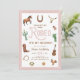 Este convite fofo para a vaqueira diz "este não é o meu primeiro rodeio, é o meu segundo!" em texto ocidental angustiado. À sua volta estão as ilustrações do oeste selvagem com cor d'água. Terminou com uma borda rosa e um pequeno detalhe cardíaco.