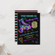 Cilindro de vamos e brilho com esses convites de festas de aniversários de patinação de cilindro de neon. Possui fontes neon, pizza, estrelas e skates de rolo em um fundo preto. Bares de cor neon na parte de trás. Excelente para uma garota ou um garoto! Todos os textos podem ser alterados. Para fazer mais mudanças, vá para Personalizar este modelo. Na parte inferior você verá "Quer personalizar este design ainda mais? Clique em EDIT usando a ferramenta Design. A partir daí você pode mudar algumas fontes e algumas cores, mover coisas ou excluir o que você precisa.
