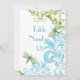 PALETA DE CORES: azul aqua, azul céu médio, verde menta, verde esmeralda. COLEÇÃO DE DESENHOS: Cartões de Número de Mesa Correspondentes para Chás de Noiva Formais ou Recepções de Casamento ou Eventos Empresariais. Este conjunto de convite de casamento é criado a partir de ilustrações originais de aquarela de Audrey Jeanne Roberts. Padrões delicados e modernos de folhas em redemoinho em azul e verde dançam ao redor do convite com um par de libélulas lindamente detalhadas. Há uma fonte elegante e manuscrita Ampersand com o nome da noiva e do noivo e a data do casamento na frente. O verso tem os redemoinhos pintados à mão que florescem o texto do seu convite. Este é um convite de casamento de dois lados.