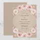 Uma delicada grinalda floral cor-de-rosa envolve o centro deste desenho. Rosas suaves e românticas e folhagens sutis criam uma atmosfera elegante e terna para o seu dia especial. Este desenho evoca uma sensação de doce intimidade.
