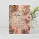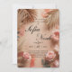 Um cartão romântico quente que combina folhas tropicais e rosas. Perfeito para casamentos de verão ou bilhetes de amor exótico.