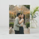 This wedding invitation features a romantic and serene design, capturing a couple embracing in front of a beautifully lit greenhouse. The color palette includes natural tones with greens from the foliage and warm yellow lights creating an inviting atmosphere. The composition focuses on the affectionate moment between the couple, set against the backdrop of lush greenery and a charming glass structure adorned with string lights. The realistic representation style enhances the genuine and heartfelt mood, making it perfect for couples seeking a tranquil and intimate wedding theme.